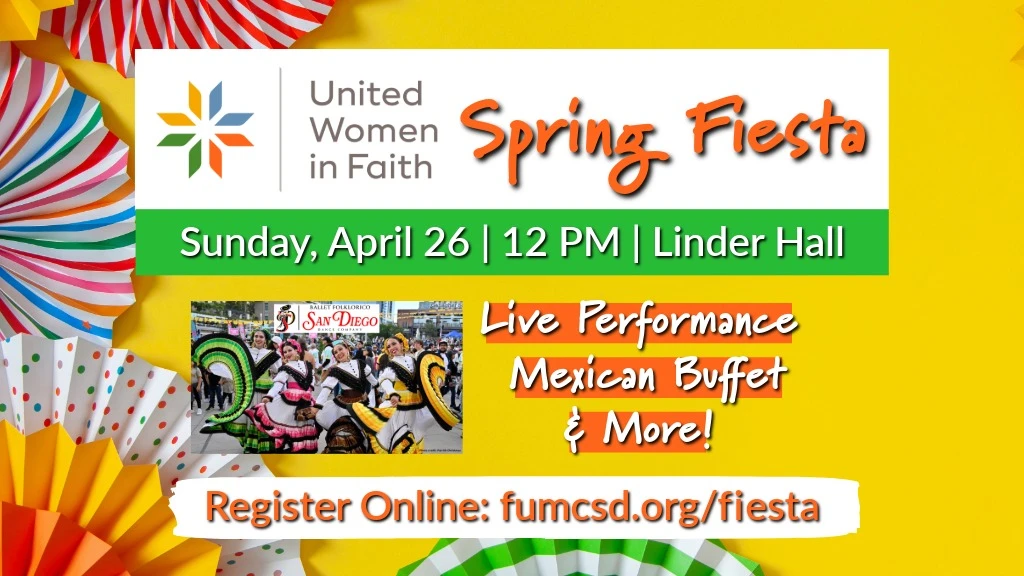 Join the FUMCSD chapter of United Women in Faith for una tarde divertida (a fun afternoon) with a Mexican food buffet, live performance by Ballet Folklorico San Diego Dance Company, silent auction, and opportunity baskets!